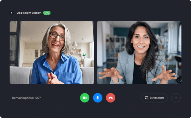 Deal Room has its own built-in conference tool. In case you don't prefer to integrate Zoom or any other external conference tool, you can host your participants inside the platform. All types of sessions and 1-1 meetings can be held inside Deal Room.