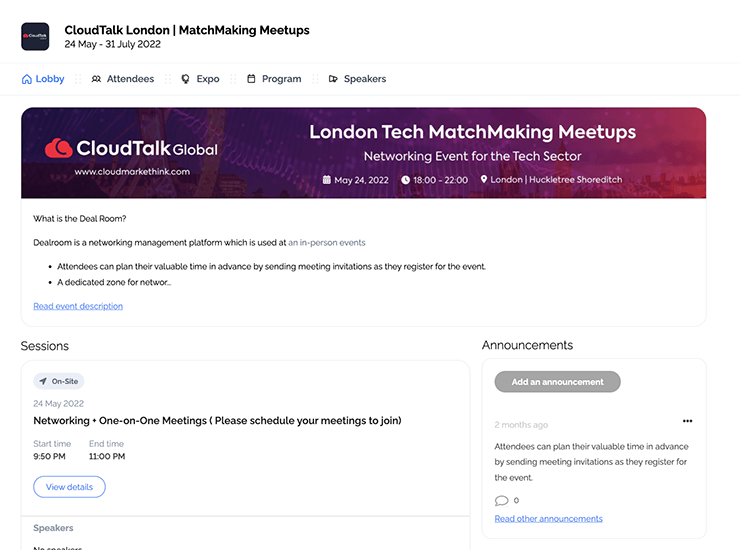 Take advantage of Deal Room, the powerful, feature-rich and cutting-edge event management platform to help you organize better events that bring value, engagement and leads to everyone.