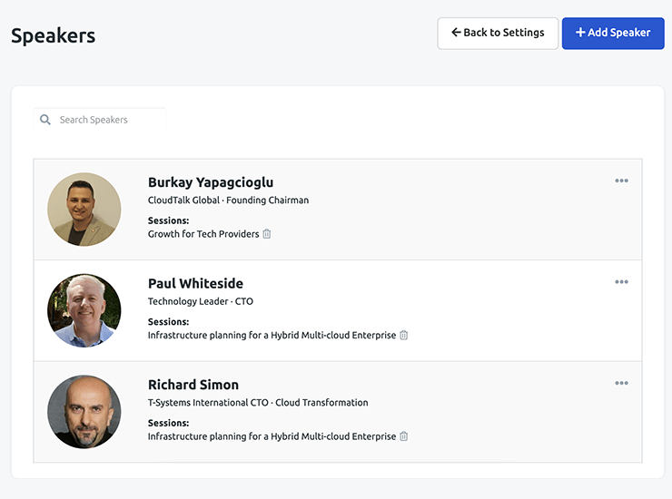 Speaker and program management tools and service provides a smooth onboarding experience for your speakers. Having speakers prepared, informing them about the platform usage, features, and potential scenarios, and creating engaging sessions are some components of Deal Room speaker and program management.